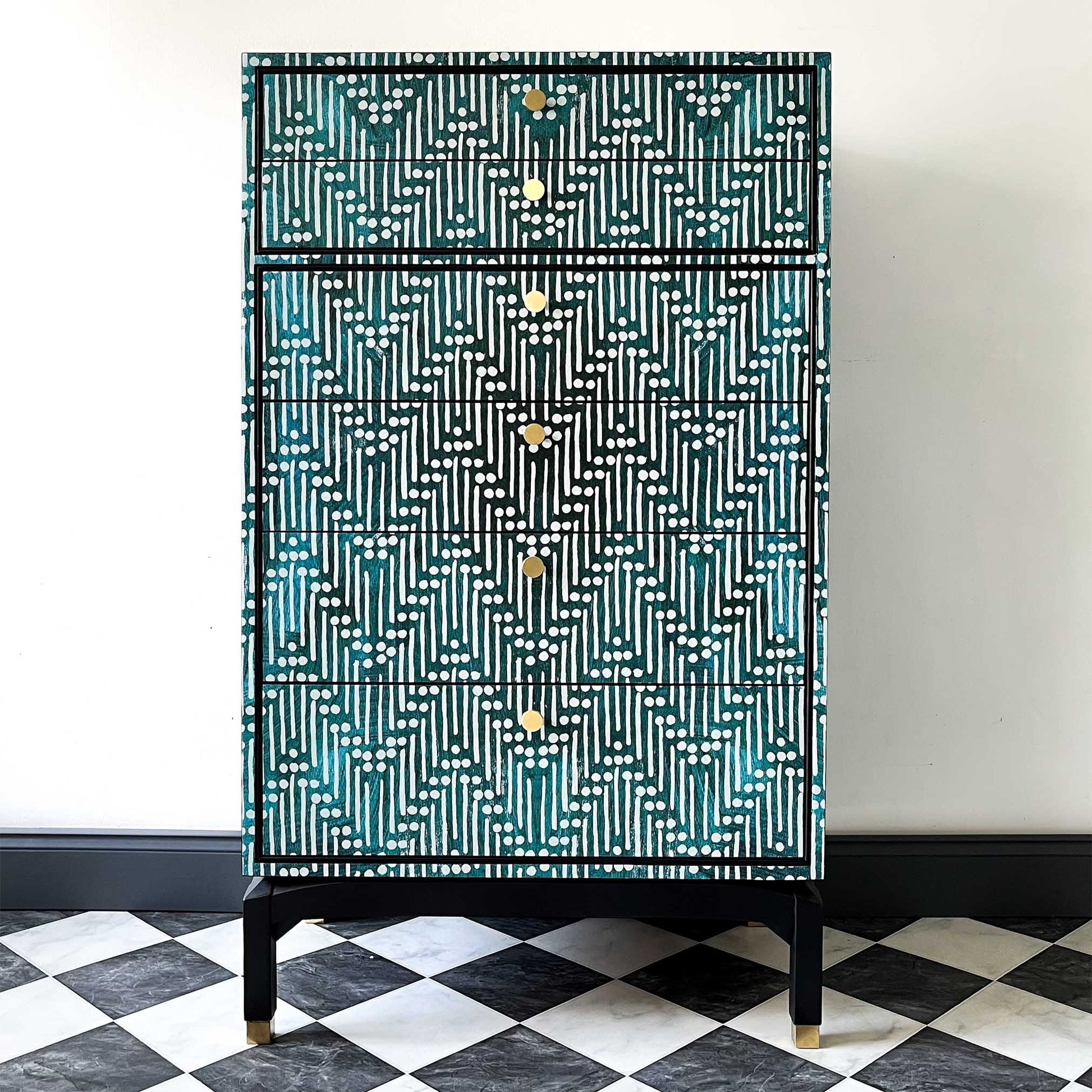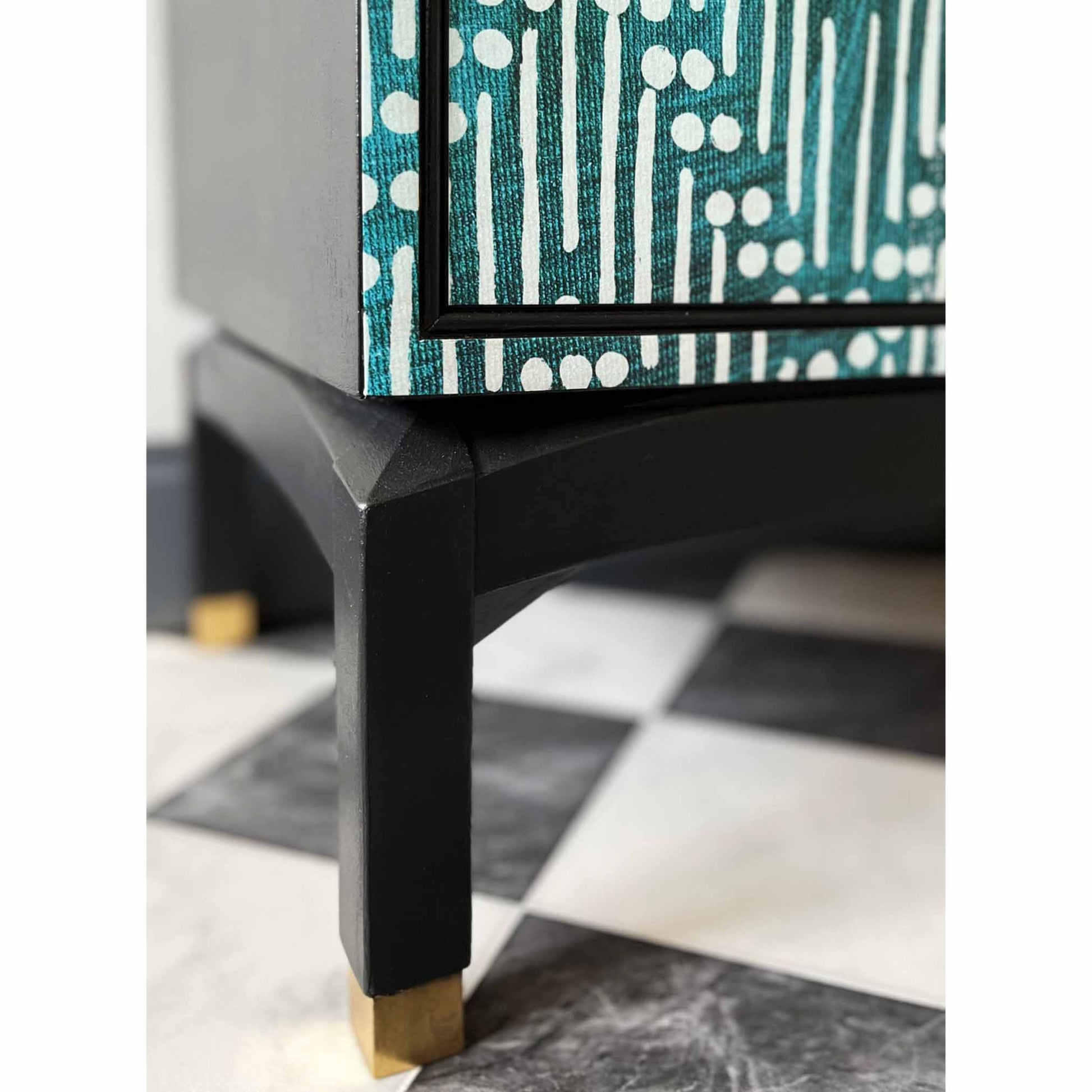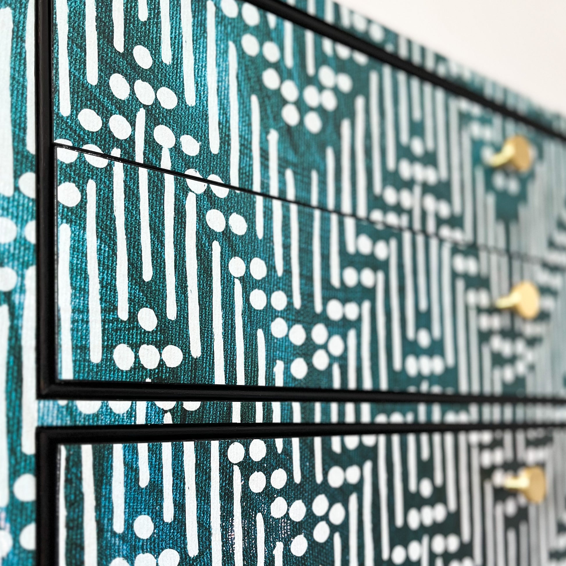 This custom design was hand drawn and created to complement wall art, but the pattern and colour can be tweaked to your personal taste. Hand painted black black colour gives a nice contrast to the teal grren that can be replaced with any other colour of your choice, creating a different mood in Your bedroom or living room. Vintage drawers are perfect storage unit and Mid-century modern design of the chest is easy to incorporate into bedroom interiors. Narrow and tall dresser is perfect for smaller space.