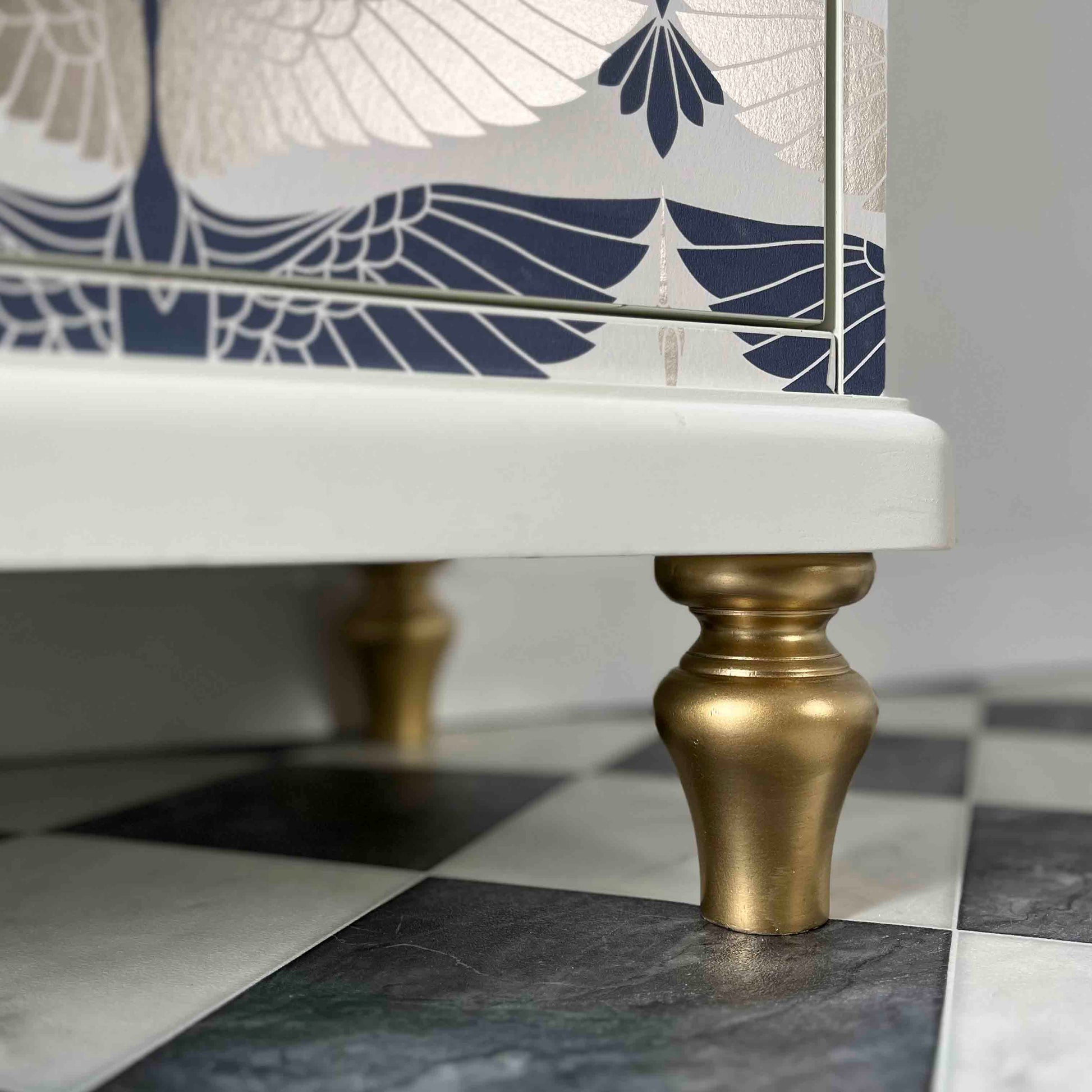 This upcycled chest of drawers features an Oriental-inspired Crane bird pattern, making it a classic addition to any bedroom.