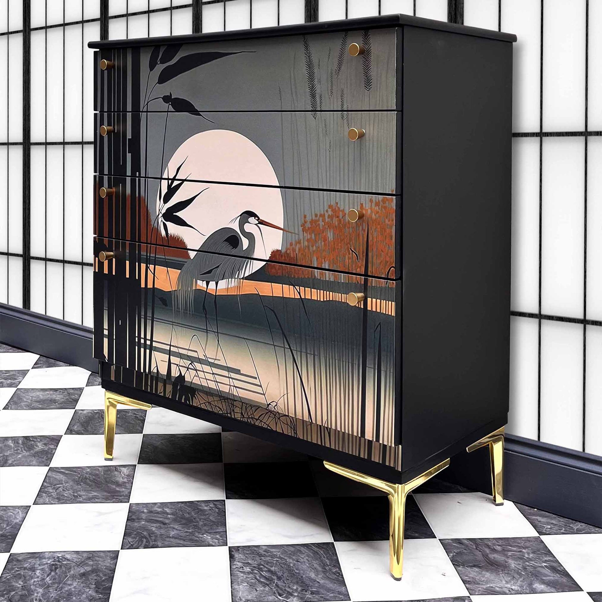A small Mid-century modern chest of drawers was hand-painted black and redecorated with a fantastic oriental Bird design. The interior is left in its original vintage state, revitalised with a fresh coat of varnish.