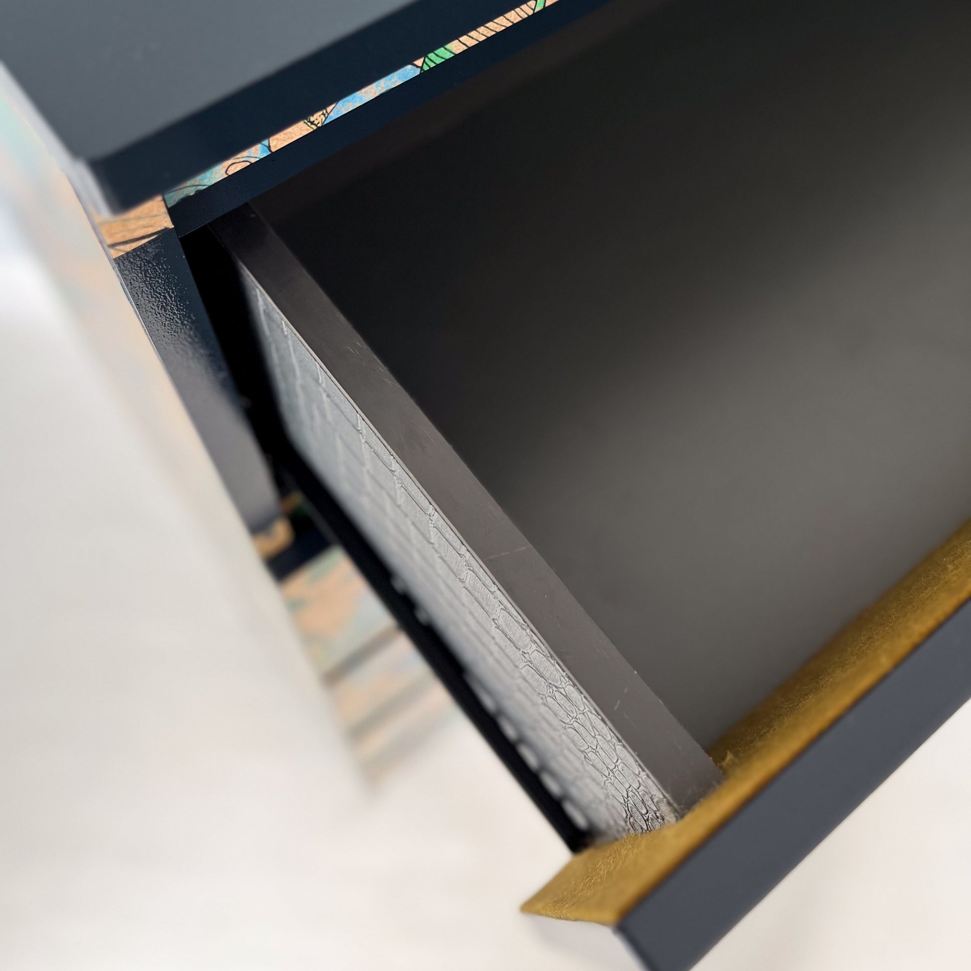 Introducing our Upcycled Jungle Chest of Drawers - a unique and eco-friendly furniture piece that seamlessly blends sustainability with vibrant aesthetics. This small chest of drawers boasts five carefully crafted compartments, each telling a story of nature's wonders through an exclusive bespoke jungle design.